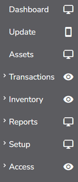 The Reports page and its five subpages: All Assets, Checked Out Assets, Checked In Assets, Transactions, and Inventory are only available to be viewed on desktop/tablet. Configure the icons