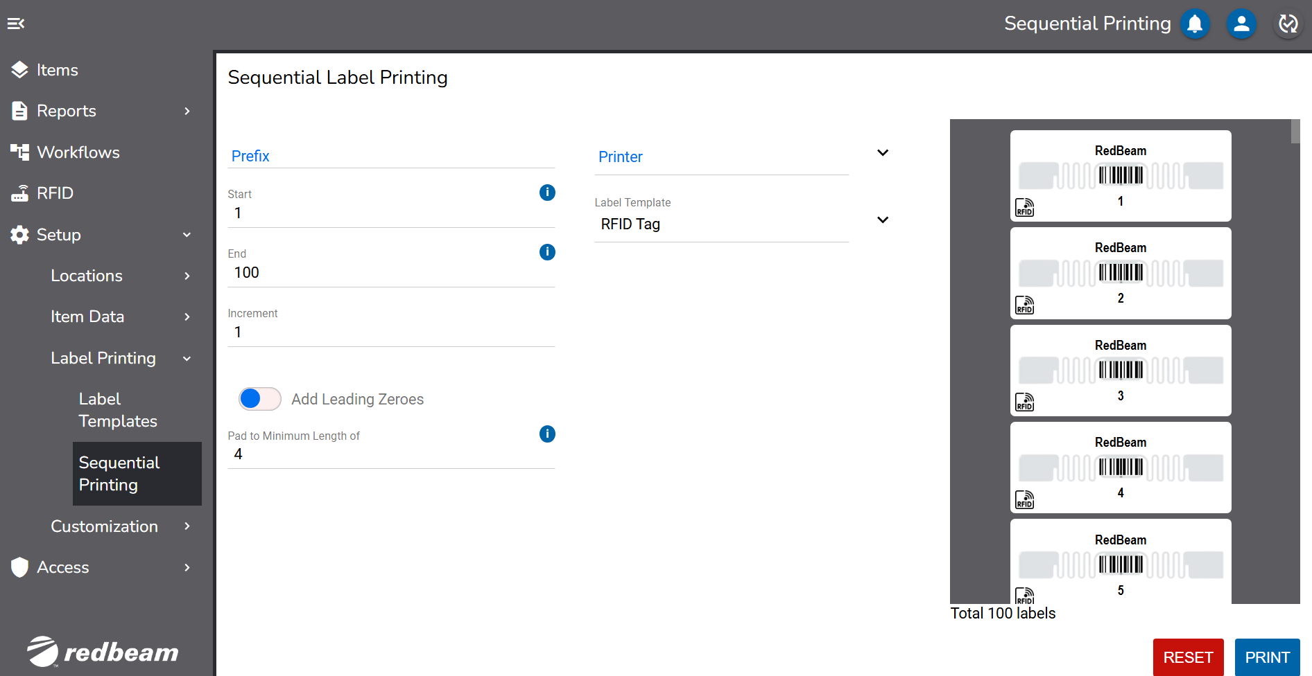 To add a prefix to all the labels being printed (i.e. ABC), enter the prefix in the Prefix field. Labels starting at 100 will print as ABC100, ABC101 and so on.
