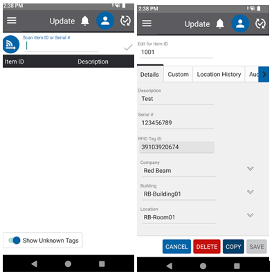 Simply read one RFID tag at a time, scan a singular barcode or type the Item ID to pull up the Item. Create a new Item by reading a tag that does not exist in the system.